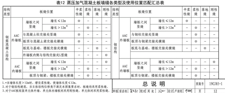 alc輕質(zhì)板的安裝構(gòu)造主要參考兩本圖集,一本是2013年12月25日發(fā)布的《蒸壓加氣混凝土砌塊、板材構(gòu)造》13J104圖集,另一本是2019年9月1日實施的《裝配式建筑蒸壓加氣混凝土板圍護(hù)系統(tǒng)》19CJ85-1參考圖集。在這兩本參考圖集中,都沒有提到alc輕質(zhì)板多長需要加構(gòu)造柱。只是在19CJ85-1參考圖集第12頁表12《蒸壓加氣混凝土板墻縫各類型及使用位置匹配匯總表》總規(guī)定,無論是鋼筋混凝土結(jié)構(gòu),還是鋼結(jié)構(gòu),當(dāng)alc輕質(zhì)板的墻長大于等于12m時,需增設(shè)柔性縫,使的墻體長度小于12m。